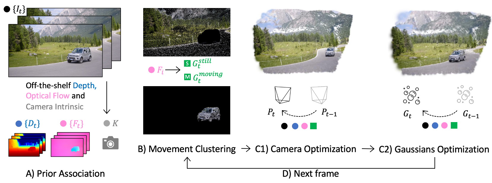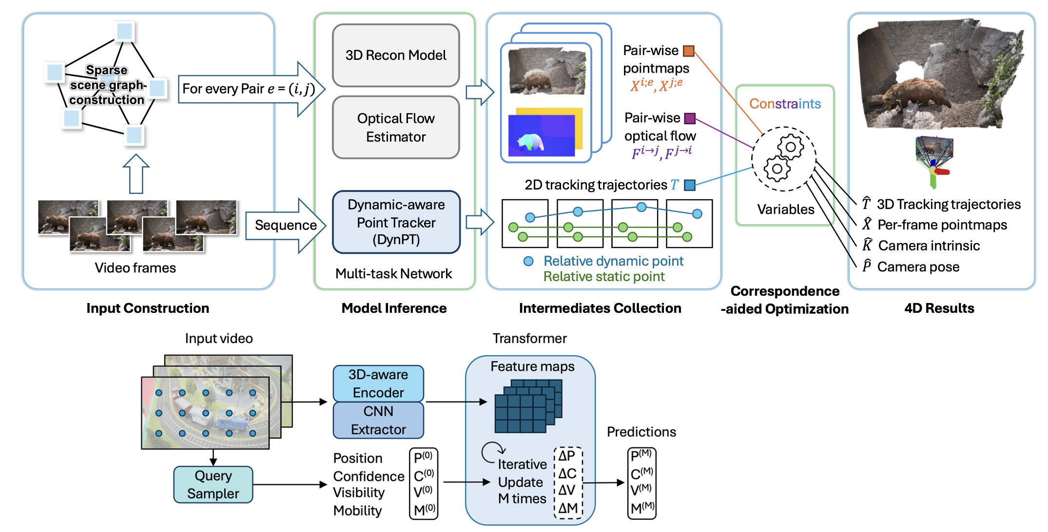 A primarily feed-forward framework for dynamic scene reconstruction. At its core, it leverages temporal correspondences to extend existing 3D formulation to 4D.